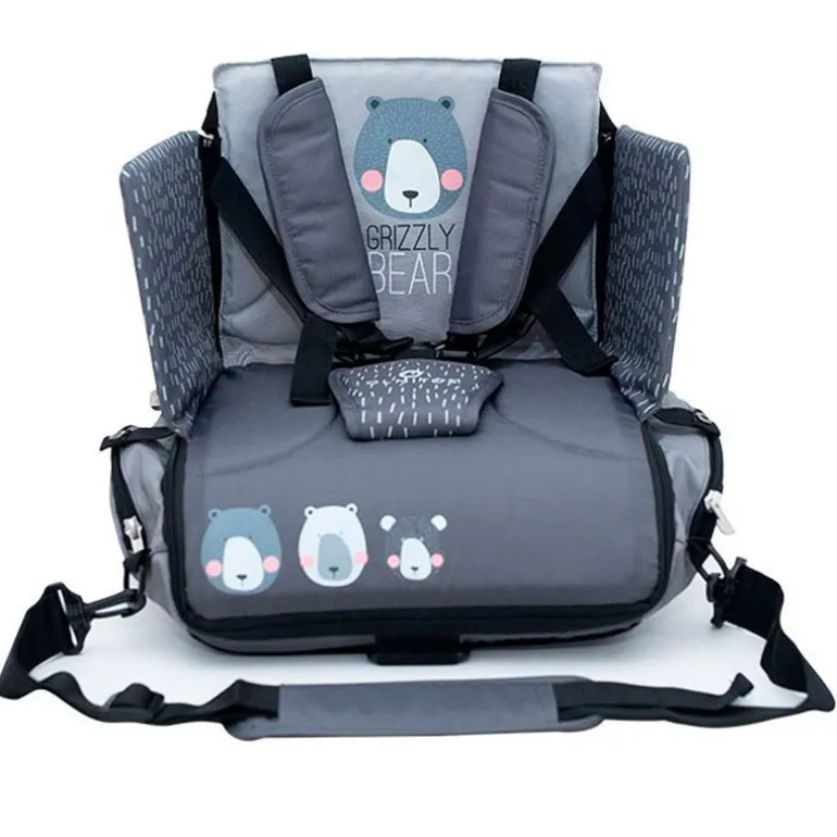Asiento elevador con adorables diseños de osito. Dispone de un arnés de seguridad ajustable que sujeta al bebé firmemente al asiento. Tiene prácticos bolsillos en los que podrás guardar todo lo que necesites para el cuidado de tu bebé. Incluye correas ajustables para acoplar al respaldo y al asiento de la silla. El asiento tiene una base rígida muy ligera para un apoyo más cómodo. La correa de seguridad permite instalar el asiento en la mayoría de sillas estándar. Es plegable, ligero y viene con asa regulable para transportarle. Abierto tiene unas dimensiones de 35 cm x 37 cm x 31 cm aproximadamente. Cerrado tiene unas dimensiones de 35 cm x 16 cm x 31 cm aproximadamente. Recomendado a partir de 12 meses.