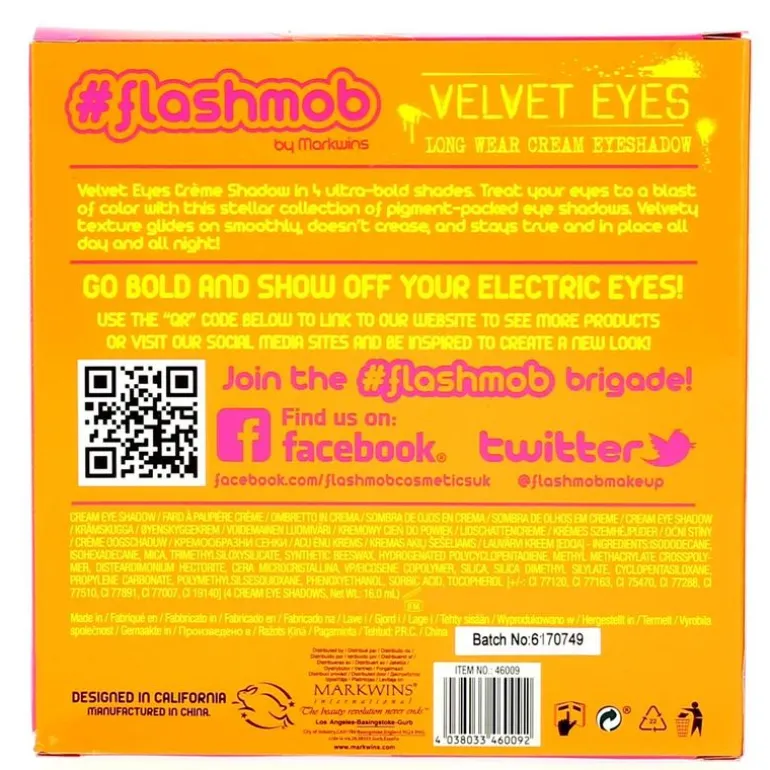 Consigue una mirada intensa y profunda con la colección de sombras de ojos ultra pigmentadas Velvet Eyes de Flashmob. El pack incluye 4 sombras de ojos -en crema- de larga duración, con una textura aterciopelada y fácil de aplicar. Peso Neto de las cuatro sombras ojos: 11,20 gramos/ml.