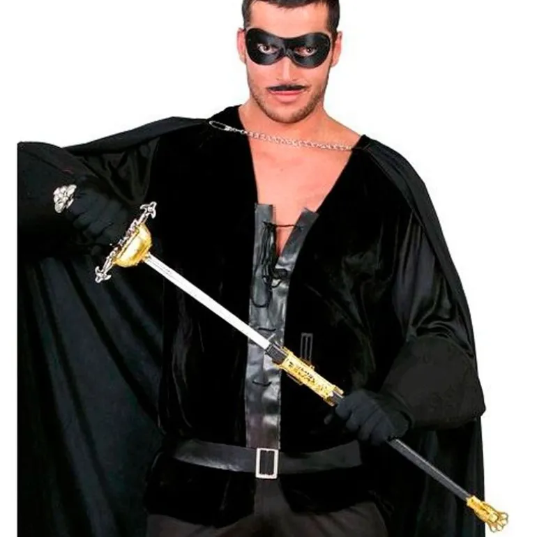 Espada de tipo florete con funda y decoraciones en tono dorado. Su tamaño es de 62 cm aproximadamente, perfecto para poder completar tu disfraz de bandolero o mosquetero.