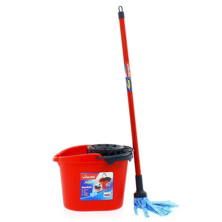Imita a tus papis y ayúdales a dejar la casa bien limpia con este set Vileda de cubo con fregona de juguete. La fregona tiene una altura de 50 cm aproximadamente y el cubo de unos 15-16 cm aproximadamente.