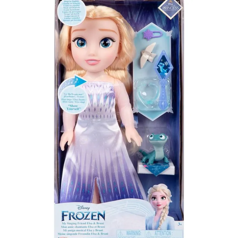 Preciosa muñeca inspirada en Elsa, princesa Disney de la película ‘Frozen’. Su tamaño es de 38 cm aproximadamente y reproduce la canción “Show Yourself” en inglés. Viene acompañada de su mascota, el lagarto Bruni y accesorios. Funciona con 2 pilas AAA incluidas (pilas de demostración). Recomendado a partir de 3 años.