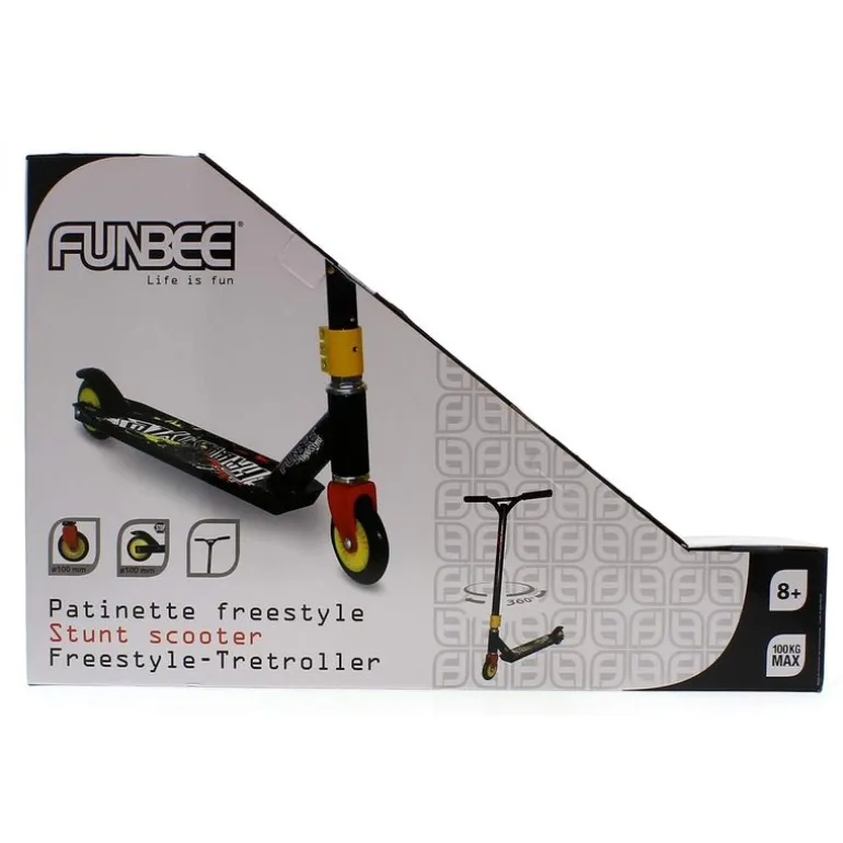 Nuevo patinete funbee freestyle medium de aluminio y estructura acero. Especialmente indicado para niños que desean iniciarse en esta actividad (principiantes y/o práctica intermedia). Con freno trasero. Su altura es de 56 cm aproximadamente.
