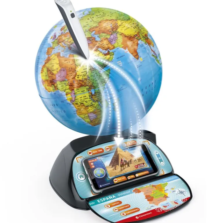 Dispone de bolígrafo inalámbrico que te permitirá descubrir los continentes, capitales, la superficie, la flora, la fauna, los himnos nacionales, idiomas, historia, curiosidades, platos típicos, distancias y puntos de interés.