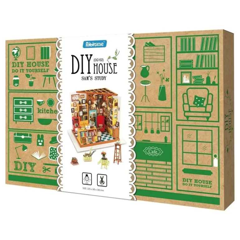 Maqueta con las que podrás construir la habitación de estudio de Sam, mientras ensamblas, cortas y pegas pequeñas piezas de objetos para crear un diseño único.