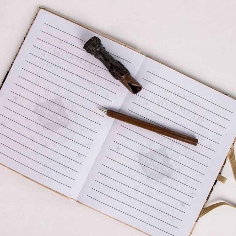 En el interior encontrarás una libreta con luz, un bolígrafo en forma de la varita de Harry Potter y un mapa de los Marauders.