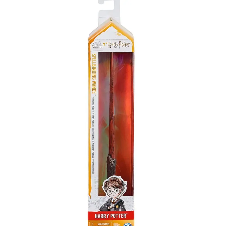 Varita mágica con el diseño con la que aparece el mago Harry Potter. Con detalles auténticos y una base con peso que facilita su sujeción. Su tamaño es de 30 cm aproximadamente. Viene acompañada de una tarjeta para ayudarte a dominar uno de los hechizos. Recomendado a partir de 6 años.