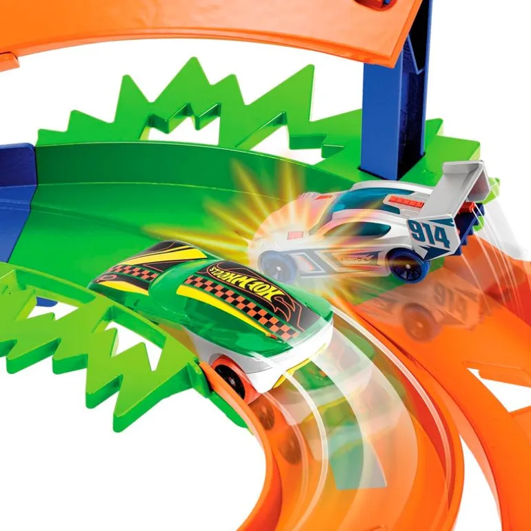 Circuito de la colección Hot Wheels Action que te permitirá competir con 2 vehículos de la colección escala 1:64. Haz acrobacias mientras saltas por encima de obstáculos y escapa de la zona de choque para ser el primero en terminar el circuito con doble pista. Contiene 2 vehículos de escala 1:64 para comenzar a jugar. Podrás plegarlo por la mitad para guardarlo y su asa facilita que puedas llevarlo contigo donde quieras. Recomendado a partir de 4 años.