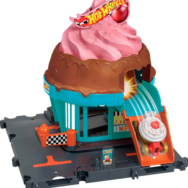 Entra en la heladería de Hot Wheels, gira la espiral de fresa para mover el coche por la heladería. Incluye un delicioso vehículo Hot Wheels con una escala de 1:64. Cuando llega a lo más alto, el coche arranca automáticamente en busca de nuevas aventuras. Recomendado a partir de 4 años.
