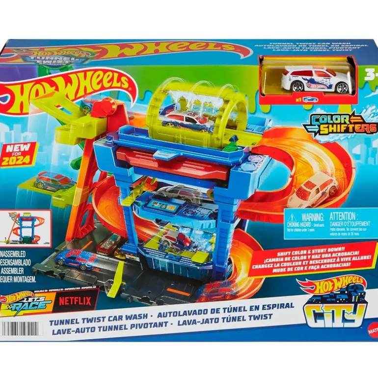 Coge el ascensor para elevar el coche hasta la planta superior del túnel de lavado. El conjunto contiene un vehículo de la colección Hot Wheels Color Shifters con una escala de 1:64 ¡Dale vueltas al túnel para rociar el coche Color Shifters con agua muy caliente e inicia el primer cambio de color! Sal del túnel y baja la rampa hasta la estación de decoración, donde hay un rodillo de espuma y un aspirador para una limpieza completa. Sumerge el vehículo en el tanque de agua fría para devolverlo a su aspecto original. Tanto el tanque de agua caliente como el de agua fría se extraen fácilmente para una limpieza sencilla. Recomendado a partir de 3 años.