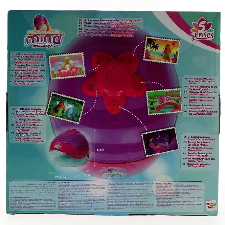 Mind Massage es un casco de masajes para conseguir un relax absoluto. El casco de masaje Mind Massaje cuenta con cinco masajes distintos, de dos minutos de duración, acompañados de una relajante música que transportará tu mente a cinco exóticos lugares. El casco de masaje Mind Massage incluye las siguientes opciones de masaje: masaje equilibrante de la selva amazónica, masaje sensitivo de los baños árabes, masaje armonizante de las montañas tibetanas, masaje enérgico de las playas hawaianas y masaje vitalizante de los jardines orientales. Los masajes se realizan con vibraciones que actúan en distintas partes de la cabeza, con diferentes intensidades y velocidades.