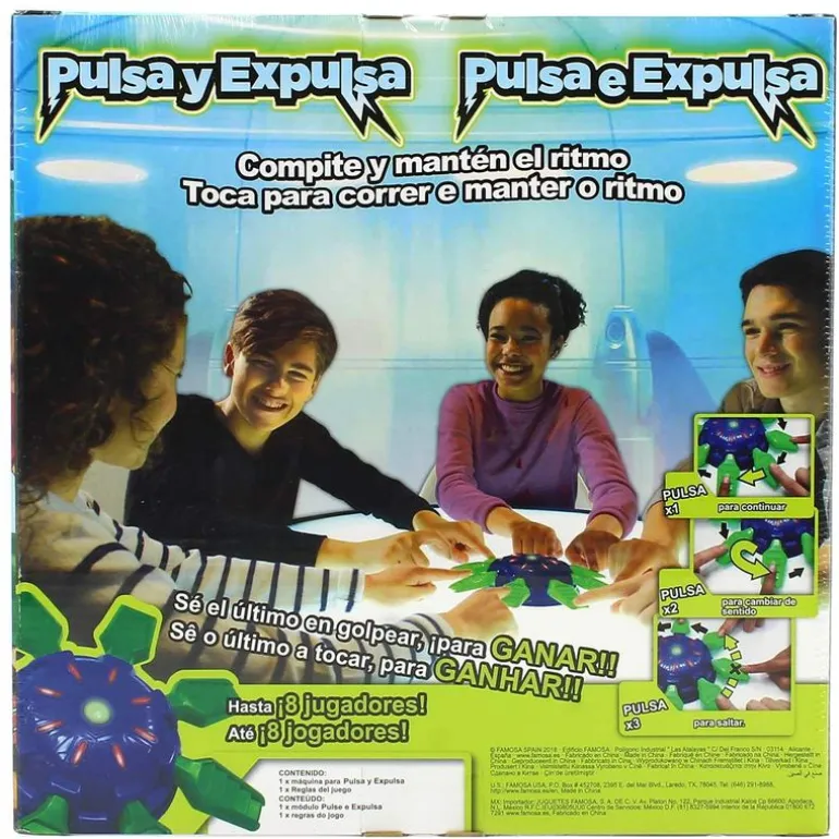 Pulsa y Expulsa es un trepidante juego de habilidad que requiere de toda tu astucia y atención. Deberás fijarte muy bien en la cantidad de veces que los demás jugadores tocan su pulsador ¡Tu dedo y tu mente deberán estar conectados! Si pulsas una vez, el pulso pasará al siguiente jugador, al tocar 2 veces invertirás el pulso y si tocas 3 veces saltará al siguiente jugador. No te equivoques o pulses antes de tiempo… ¡Quedarás fuera del juego! El último jugador que quede será el ganador. De 2 a 8 jugadores. Funciona con 3 pilas AAA NO incluidas. Recomendado a partir de 6 años.
