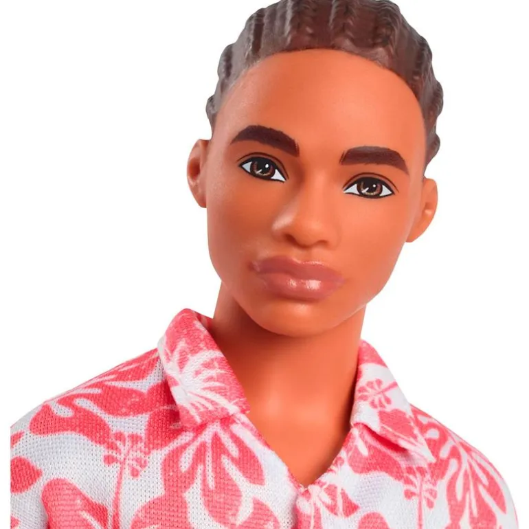 Muñeco de la colección Ken Fashionista que luce un mono con estampado hawaiano en blanco y coral que hace que su personalidad destaque.
