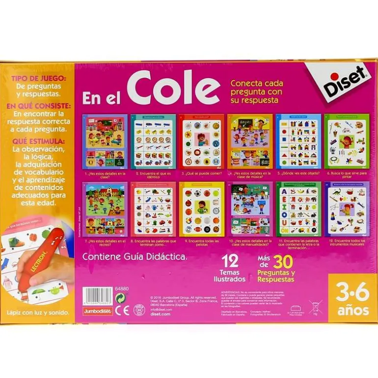 Completo juguete educativo de preguntas y respuestas. Lectron es fácil de jugar y gracias a su sistema auto-correctivo el niñ@ podrá comprobar si está en lo cierto. Incluye 12 láminas ilustradas con más de 30 ejercicios con el tema «en el cole», para conocer los diferentes ambientes y elementos que se encuentras en el entorno escolar. Edad recomendada de 3 a 6 años.