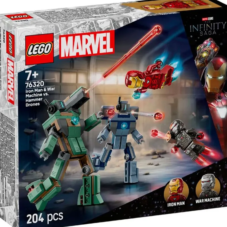 Cuenta con minifiguras de Iron Man y Máquina de Guerra, así como con 2 drones de Hammer construibles articulados para aportar dinamismo al juego.