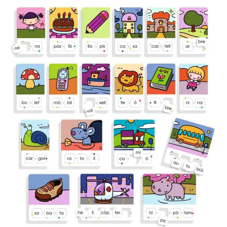 Juego con el que los pequeños de la casa aprenderán a separar las silabas de las palabras. En el interior encontrarás 19 encajables con palabras de 2,3,4 síl·labas. Recomendado a partir de 4 años.