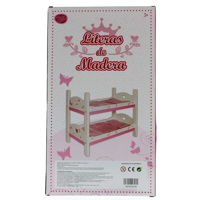 Pon a tus muñecos a dormir en esta preciosa litera blanca, con bonitos detalles en color rosa. La litera se puede separar para transformarla en dos camitas independientes. Ropita de cama incluida. NO INCLUYE MUÑECOS.
