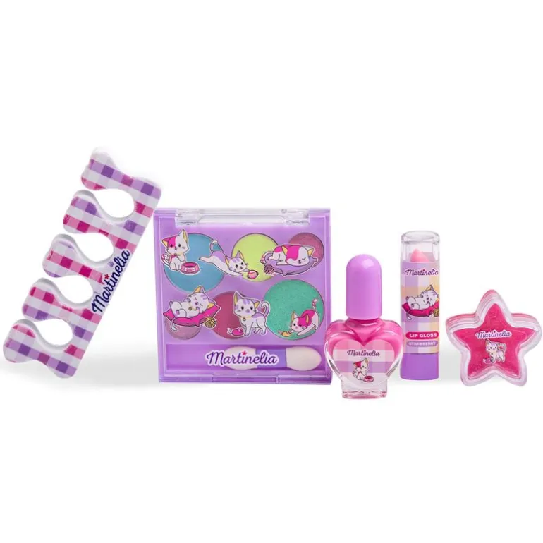 En el interior encontrarás una paleta de sombra de ojos de colores diferentes, un aplicador, un labial, un lip gloss, un esmalte de uñas y un separador de dedos.