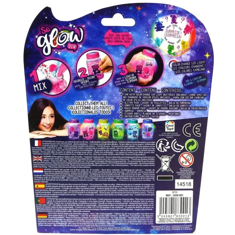 Divertido set individual con el que podrás crear tu propia jarra mágica. Simplemente tendrás que llenar el bote de agua, añadir la purpurina y el confeti y colocar la sorpresa en su interior ¡Agítalo y verás el increíble efecto luminoso! Funciona con 2 pilas de botón incluidas (pilas de demostración). Recomendado a partir de 6 años.