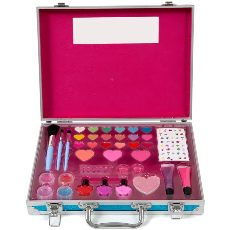 Maletín de maquillaje infantil para que las más pequeñas de la casa dejen volar su imaginación y creen los looks más coloridos. Contiene 18 sombras de ojos, 3 coloretes, un esmaltes de uñas, una lima de uñas, 2 brillos de labios, 4 lip gloss, 2 anillos, un brillante para uñas, una pegatina para uñas, una brocha para colorete, un pincel de sombras y un pincel de labios.