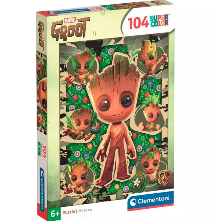 Puzzle compuesto de 104 piezas con las que podrás construir una imagen inspirada en Groot, personaje de los famosos comics y películas de Marvel.