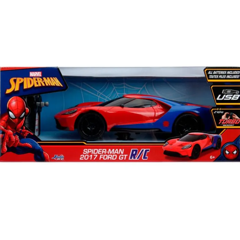 Vehículo Ford GT 2017 inspirado en tu superhéroe favorito, el increíble Spider-man. Tiene una escala de 1:16. Es un vehículo multidireccional con función turbo. Su mando tiene un alcance de 2.4 Ghz. Podrás cargarlo gracias a la batería que incluye y su USB. El mando funciona con pilas NO incluidas. Sus dimensiones son de 49 cm x 37 cm x 18 cm aproximadamente. Recomendado a partir de 6 años.
