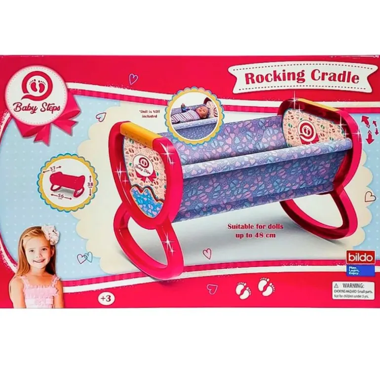 Mi primera cuna de muñecas para las más pequeñas de la casa. Se balancea y tiene unas dimensiones de 38 cm de alto x 56 cm de largo x 37 cm de ancho aproximadamente. Es compatible con 48 cm aproximadamente. Recomendado a partir de 3 años.