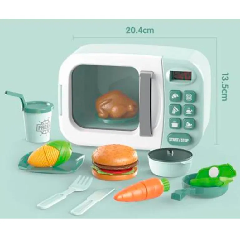 Microondas con funciones para que los más pequeños de la casa se acostumbren a las tareas de casa o puedan completar su cocina infantil. Viene acompañado de menaje y accesorios para que puedas cocinar. Las dimensiones del microondas son de 13.5 cm de alto x 2.4 cm de largo aproximadamente. Recomendado a partir de 3 años.