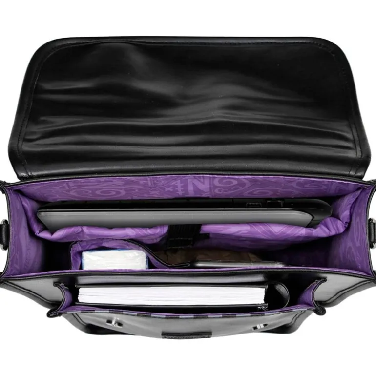 Bolso convertible en mochila inspirado en la serie de Netflix de Miércoles Addams. Bolso-mochila con cierre de dos imanes y bolsillo frontal cubierto por una solapa. Con forro interior con compartimento acolchado para dispositivos electrónicos y otros bolsillos adicionales. Asa bandolera de 122 cm convertible en correas al hombro. Sus dimensiones son de 34 cm x 28 cm x 11 cm aproximadamente.