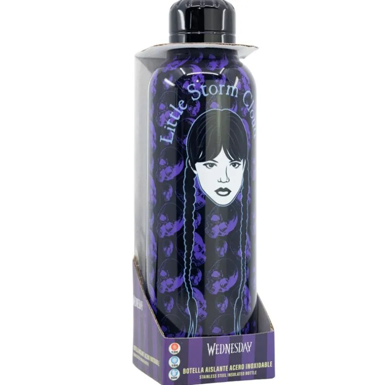 Botella térmica con doble aislamiento, para mantener tus bebidas frias o calientes, con un diseño inspirado en Miércoles Addams. Dimensiones: 24.2 x 7.1 x 7.1 cm Peso: 302 g Composición: Acero inoxidable Capacidad: 515 ml