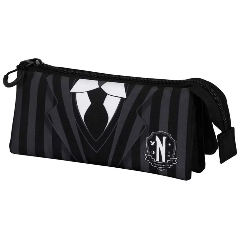 Portatodo triple con diseños inspirados en la serie de Netflix Miércoles. Dispone de 3 compartimentos para tus accesorios. Sus dimensiones son de 11 cm x 23 cm x 7 cm aproximadamente.