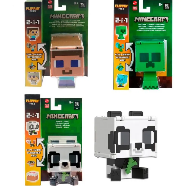 ¡Dale la vuelta! Prepárate para una acción con la figura coleccionable Flippin Figs de Minecraft. Su tamaño es de 9.5 cm aproximadamente. Solo tienes que levantar los paneles de la cabeza extragrande de la figura y encajarlos en su sitio para revelar una figura de Minecraft diferente en cuestión de segundos. Recomendado a partir de 6 años.
