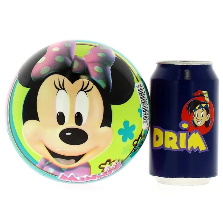 Una pelota de plástico, de 15 cm de diámetro, con los colores y decoraciones de la Minnie.