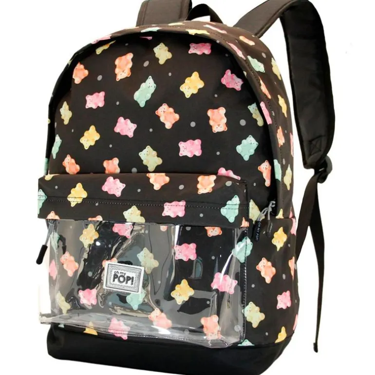 Mochila escolar con diseños de golosinas. Dispone de 2 compartimentos, de diferente tamaño, para que puedas guardar en el interior tus libros y accesorios escolares. Su bolsillo frontal es transparente. Sus correas son acolchadas y ajustables. Es adaptable para carro NO incluido. Sus dimensiones son de 30 cm x 41 cm x 18 cm aproximadamente.