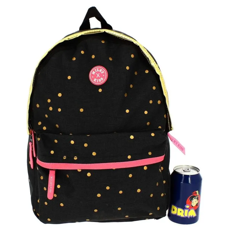 Mochila de 39 cm de color negro. Tiene un estampado de lunares pequeños en color dorado y detalles en rosa. Su diseño es ideal para que las más peques la lleven al cole. Tiene dos compartimentos: El principal es espacioso y tiene un cierre de cremallera y el segundo se encuentra en la parte frontal, siendo un poco más pequeño pero perfecto para almacenar accesorios, tiene también un cierre de cremallera. Mide 39 cm (alto) x 29 cm (ancho) x 16 cm (fondo) aproximadamente.