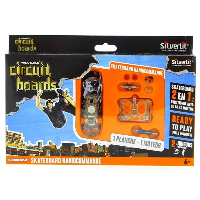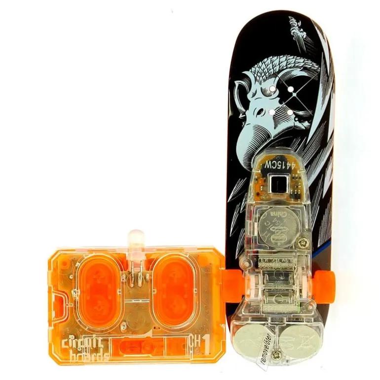 Monopatín radiocontrol con el diseño de un halcón blanco en un fondo negro, pertenece a la colección de Tony Hawk. Podrás disfrutar de sus dos modos de juego, el manual en el que lo podrás utilizar como si de un monopatín de dedos se tratase o con el mono teledirigido utilizando el mando que incluye. En el interior encontrarás la carcasa de la tabla, 4 ruedas y las herramientas necesarias para montarla. Funciona con 3 pilas LR44 incluidas (pilas de demostración) y el mando con 2 pilas LR44 incluidas (pilas de demostración). Recomendado a partir de 6 años.