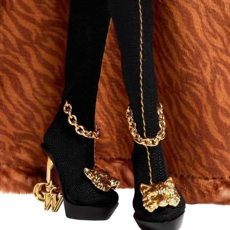 ¡Clawdeen Wolf está más que preparada para arrasar en la pasarela con sus pantabotas negras! Las botas cuentan con costuras y apliques dorados para añadir un toque de brillo.