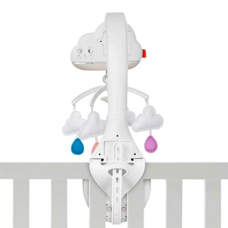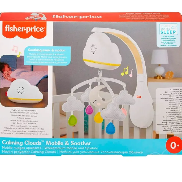 Móvil y proyector Calming Clouds de la colección Fisher Price, con el que tu bebé podrá descansar con música, sonidos y luces. Dispone de una lista de reproducción aprobada por expertos en sueño y luces tenues que ayudarán a dormir a tu pequeñ@. Tiene sensor de sonido, por lo que se reiniciará automáticamente cuando tu bebé haga algún ruido. A medida que tu bebé vaya creciendo podrás convertir el móvil en proyector, una máquina de sonidos de sobremesa con luz quitamiedos. Funciona con 3 pilas LR6 NO incluidas. Móvil recomendado de 0 a 5 meses y proyector de sobremesa a partir de 5 meses.