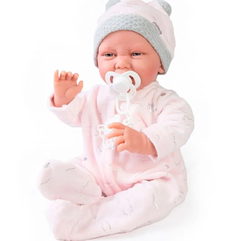 Carla es una muñeca recién nacida de la colección Antonio Juan. Su cuerpo es de tela blandita y su cara y extremidades son de suave vinilo. Viste un pijama de nubes y un gorro a juego con pompones. Su tamaño es de 42 cm aproximadamente y pesa 800 gramos. Incluye chupete y cojín.