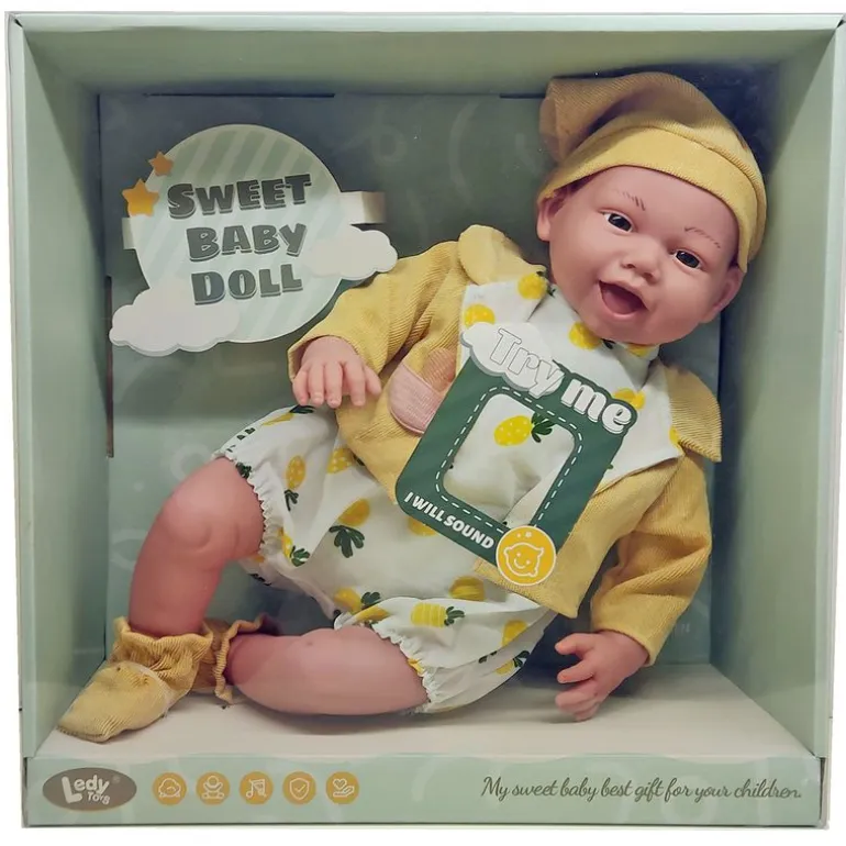 Muñeco bebé con extremidades de vinilo y cuerpo blandito para que puedas ponerlo en diferentes posturas, como si fuera un bebé de verdad. Va vestido con un adorable pijamita y un gorrito a conjunto. Reproduce sonidos. Su tamaño es de 40 cm aproximadamente. Funciona con pilas incluidas (pilas de demostración). Recomendado a partir de 3 años.