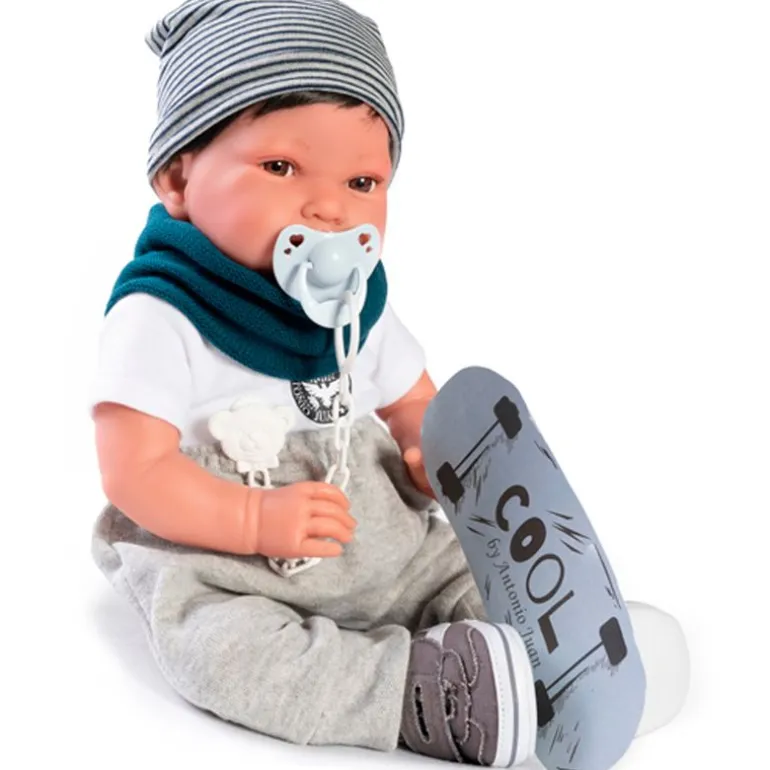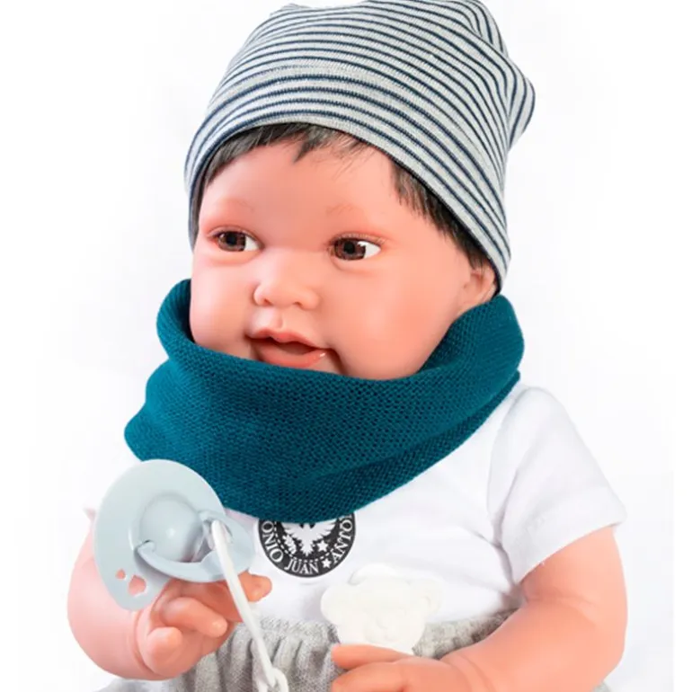 Pipo es un adorable muñeco bebé de la colección Antonio Juan. Su cuerpo está fabricado en tela blandita para que puedas abrazarlo, su cara y extremidades son de vinilo suave. Su tamaño es de 42 cm aproximadamente y pesa 800 gramos. Pipo puede ponerse en diferentes posiciones, ya que sus extremidades se pueden girar. Viene acompañado de un gorro, un cuello, camiseta, pantalones y zapatillas.