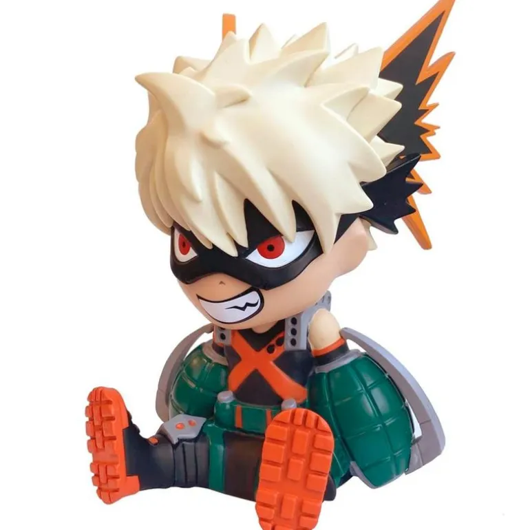 Hucha con llamativo diseño del personaje Katsuki Bakugo de la serie de anime My Hero Academia. Su tamaño es de 18 cm aproximadamente.