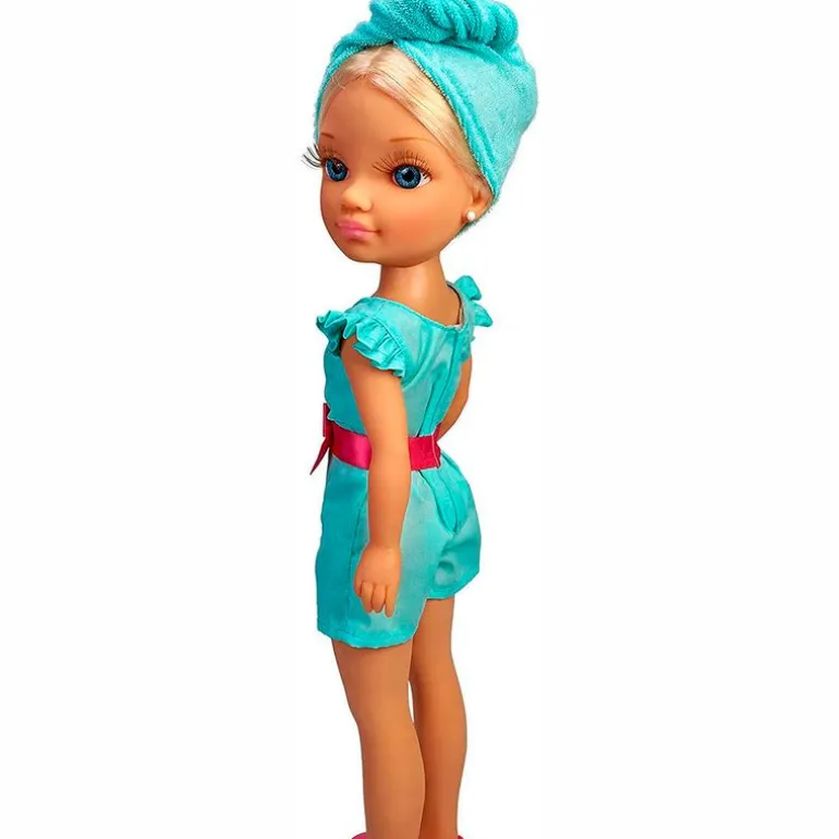 Nancy necesita cuidar su preciosa melena y pasará un divertido día en la peluquería contigo. En el interior encontrarás un pack de belleza con muchos accesorios y elementos de peluquería. Nancy va vestida con un mono turquesa, unas bailarinas rosas y un pañuelo en el cabello. Sienta a Nancy en el sillón reclinable para que pueda lavarse el pelo como si estuviera en una peluquería de verdad ¡El lavado funciona gracias al depósito y al botón que hay en el pie del sillón! El grifo se puede sacar y extender ¡Seca el cabello de Nancy con la toalla! Peina a Nancy con los peines, botes, un secador, una plancha del pelo, unas tijeras y un espejito. La muñeca tiene un tamaño de 42 cm aproximadamente. Recomendado a partir de 3 años.