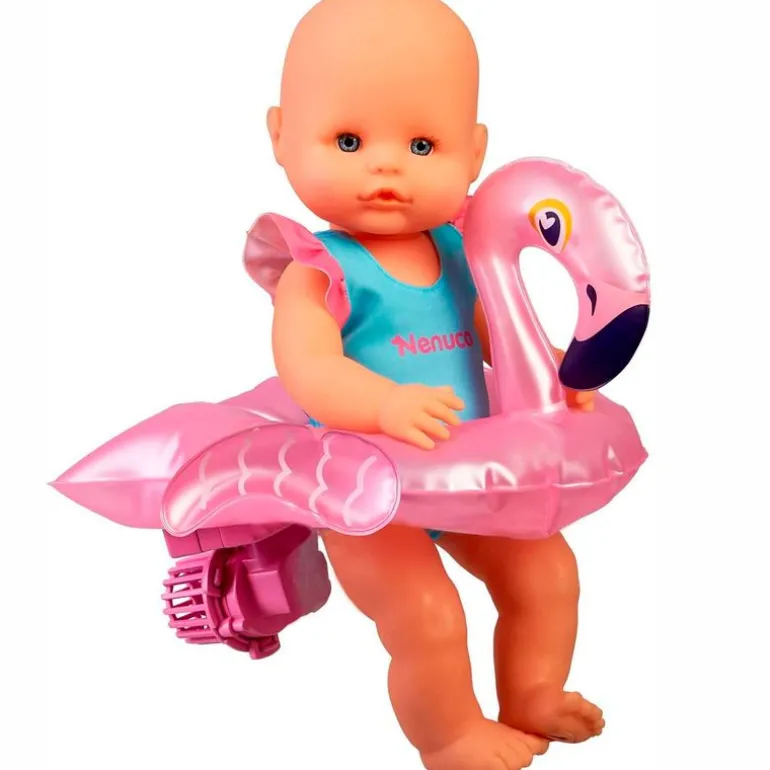 Nenuco ¡Hora de nadar! Es un muñeco bebé al que le encanta estar en el agua ¡Viene preparado para pegarse un chapuzón contigo! Ideal para meter dentro de la bañera o incluso en la piscina. NO se puede bañar en agua del mar, ya que la sal lo dañaría. Viene acompañado de un bañador y un flotador preciosos. ¡El flotador tiene un motor que hace que se mueva! Al meterlo en el agua comenzará a moverse solo. Recomendado a partir de 2 años.