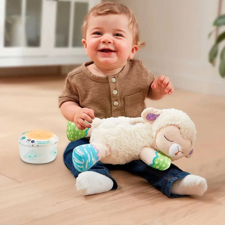 Ovejita dulces sueños es un adorable proyector que acompañará a los más pequeños de la casa a la hora de dormir y los calmará con relajantes melodías y sonidos de la naturaleza, acompañados con suaves proyecciones luminosas para ayudarle a dormir mejor. Dispone de tres modos de uso diferentes: Proyector, Luz de noche e historias infantiles, activación por llanto, música, temporizador y volumen. Con más de 70 canciones, melodías, frases y sonidos. Superficie lavable extrayendo el componente electrónico. Funciona con 3 pilas AA incluidas (pilas de demostración). Recomendado a partir de 0 meses.