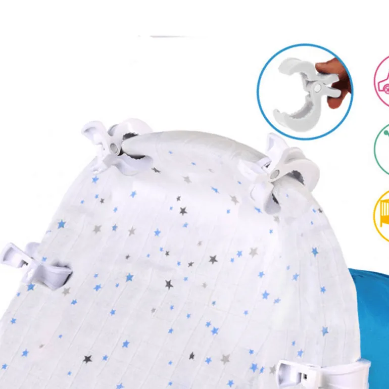 Práctico set de 4 pinzas de plástico para sujetar las muselinas a la capota de la sillita y evitar que se muevan con el viento.