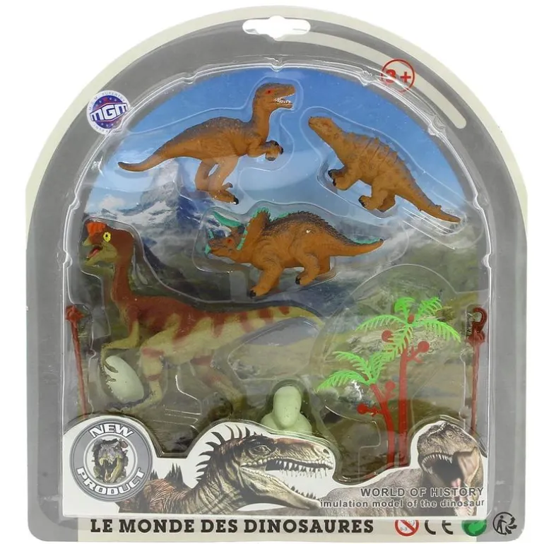 Pack de dinosaurios donde encontrarás 4 figuritas de distintas especies, con un tamaño de entre 5 y 10 cm aproximadamente. En el interior incluye accesorios como un pequeño cercado, un arbusto y huevos de dinosaurio. Recomendado a partir de 3 años.