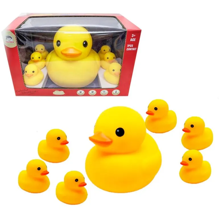Divertido set de 7 patitos de goma compuesto por 1 patito grande (la mamá pato) y 6 patitos pequeños.