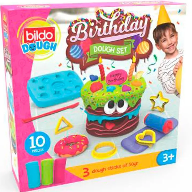 Pack de plastilina que contiene 3 plastilinas de diferentes colores, un molde y herramientas de moldeado para que puedas una tarta de cumpleaños.