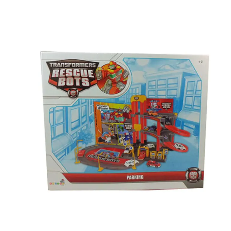 Parking Transformers Rescue Bots de 3 plantas con rampas, túnel de lavado, gasolinera, circuito, ascensor y accesorios.