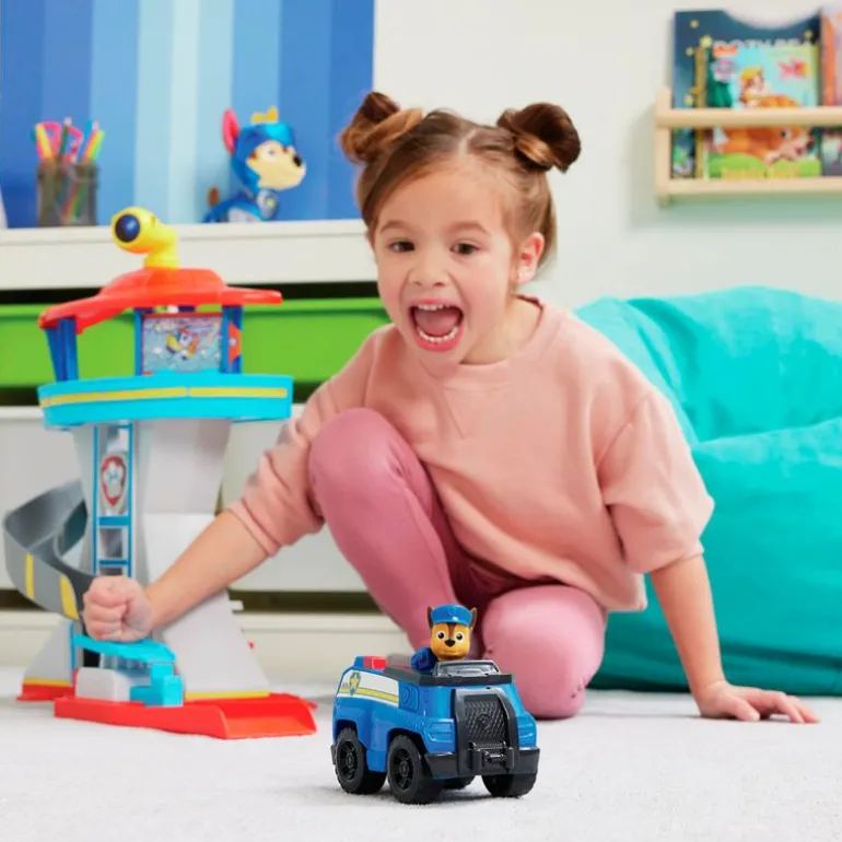 Espectacular torre de control inspirada en la famosa serie de animación Patrulla Canina. La torre tiene un tamaño de 50.8 cm de alto y te permitirá jugar 360 grados ¡Perfecta para que los más pequeños de la casa puedan proteger Bahía Aventura! Dispone de centro de comandos en el que podrás escoger 3 tarjetas de misión de doble cara, luego mira a través del periscopio para seleccionar la misión. Tiene tobogán para que el vehículo de Chase se deslice a toda velocidad y no pierda tiempo. Contiene dos figuras inspiradas en Chase, personaje de la patrulla Canina para que pueda transformarse y ponerse su traje de héroe. Recomendado a partir de 3 años.